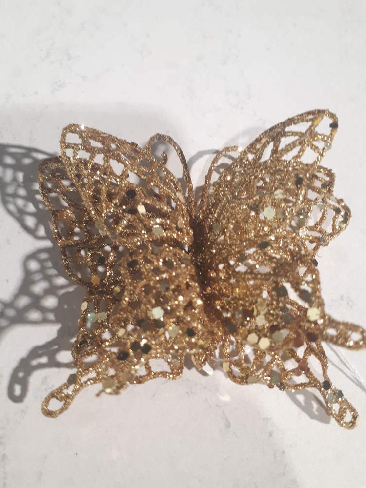 Цвет: золотой. Украшение в форме бабочки может быть использовано в качестве новогоднего декора. Имеет крепление в форме прищепки, с помощью которого его можно закрепить на елке, текстите и т.д.
